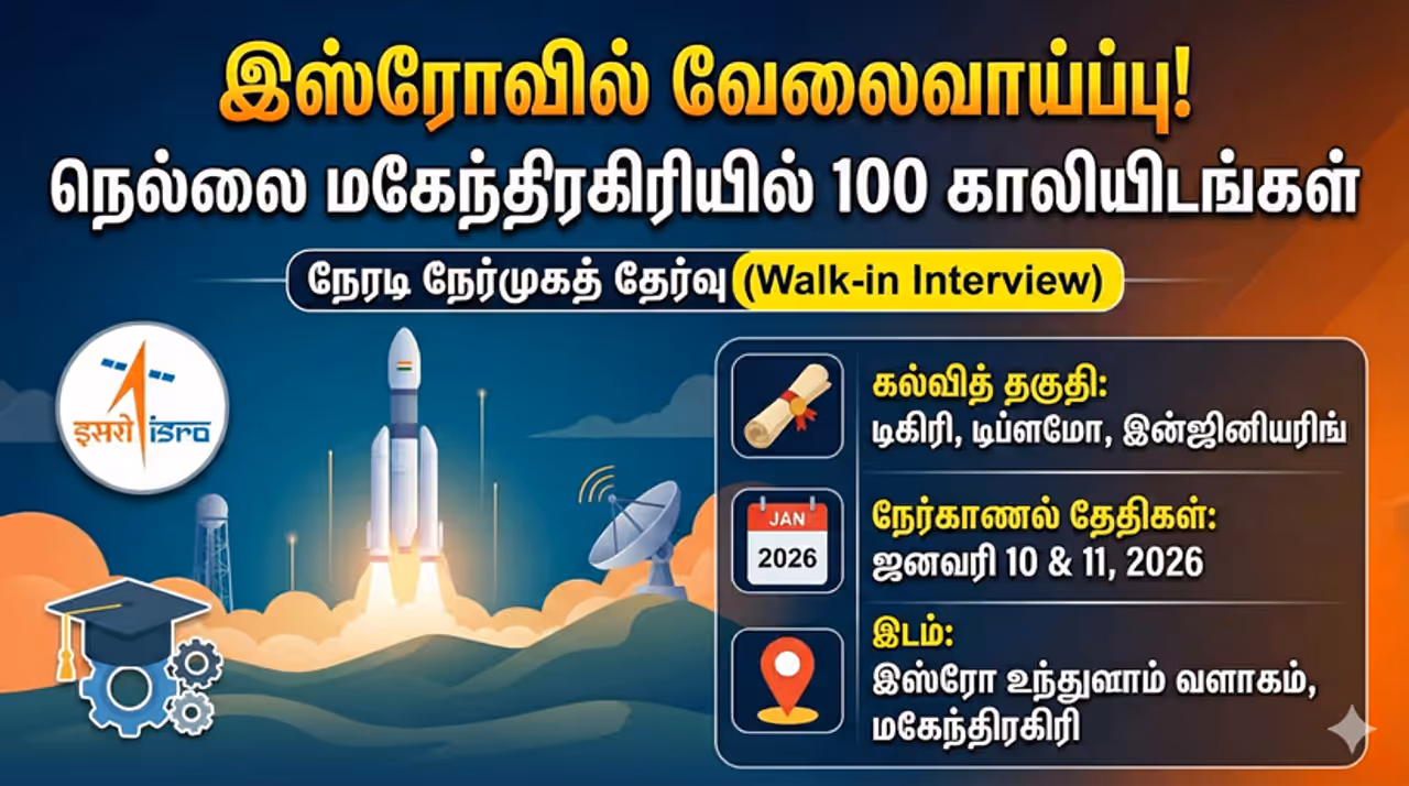 ISRO Mahendragiri நெல்லை மகேந்திரகிரி இஸ்ரோ மையத்தில் 100 அப்ரண்டிஸ் காலியிடங்கள் அறிவிப்பு. டிப்ளமோ, டிகிரி படித்தவர்கள் ஜனவரி 10, 11ல் நடக்கும் நேர்முகத் தேர்வில் பங்கேற்கலாம்.