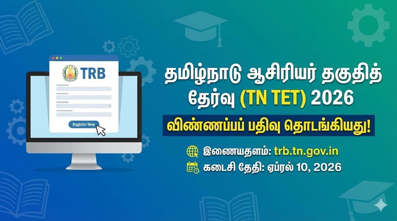 TN TET தமிழ்நாடு ஆசிரியர் தேர்வு வாரியம் (TRB) 2026-ம் ஆண்டிற்கான ஆசிரியர் தகுதித் தேர்வு (TNTET) அறிவிப்பை வெளியிட்டுள்ளது. விண்ணப்பிக்கக் கடைசி தேதி ஏப்ரல் 10, 2026.