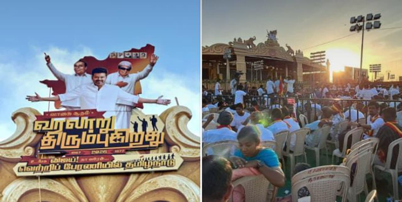 தவெக தலைவர் விஜய் முதல் மாநாட்டை 2024ம் ஆண்டு அக்டோபர் 27-ம் தேதி விழுப்புரம் மாவட்டம் விக்கிரவாண்டியில் வெற்றிகரமாக நடத்தி முடித்த கையோடு இரண்டாது மாநாடு மதுரை மாவட்டம் பாரபத்தியில் 500 ஏக்கர் பரப்பளவில் பிரமாண்டமாக இன்று நடைபெற உள்ளது. இதற்காக நேற்று இரவு முதலே மாநாட்டு அரங்கத்தில் தொண்டர்கள் குவிய தொடங்கியுள்ளனர். இந்நிலையில் மாநாடு மேடையில் பிரம்மாண்ட முறையில் அண்ணா, எம்ஜிஆர் நடுவில் விஜய் இருப்பது போல் பேனர் அமைக்கப்பட்டுள்ளது. இது அரசியல் களத்தில் பேச்சு பொருளாக மாறி உள்ளது.