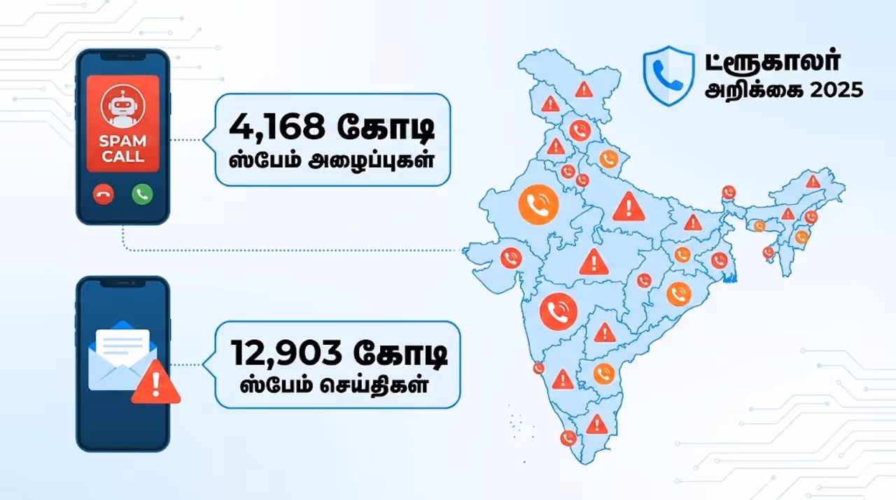ட்ரூகாலரின் 'இந்தியா இன்சைட்ஸ் அறிக்கை 2025' (India Insights Report 2025) படி, ஸ்பேம் அழைப்புகள் மற்றும் குறுஞ்செய்திகள் கட்டுப்பாடில்லாமல் அதிகரித்துள்ளன. 2025-ல் மட்டும் 4,168 கோடி ஸ்பேம் அழைப்புகள் வந்துள்ளன. இதில் 1,189 கோடி அழைப்புகளை ட்ரூகாலர் செயலி தானாகவே தடுத்துள்ளது. இதன் மூலம் இந்தியர்களின் பொன்னான நேரம் தினமும் சுமார் 21.7 லட்சம் மணிநேரம் மிச்சப்படுத்தப்பட்டுள்ளது.