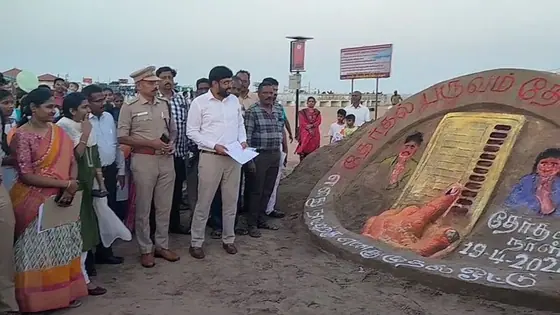 கடலூர் மாவட்டம் வெள்ளி கடற்கரையில் 100 சதவீத வாக்குப்பதிவை வலியுறுத்தி விழிப்புணர்வு மணல் சிற்பம் ஏற்படுத்தப்பட்டுள்ள நிலையில், மாவட்ட ஆட்சியர் துண்டு பிரசுரங்களை விநியோகம் செய்தார்.